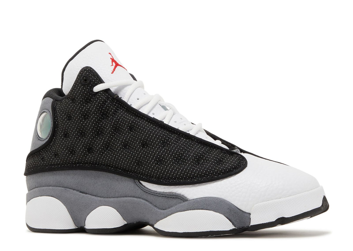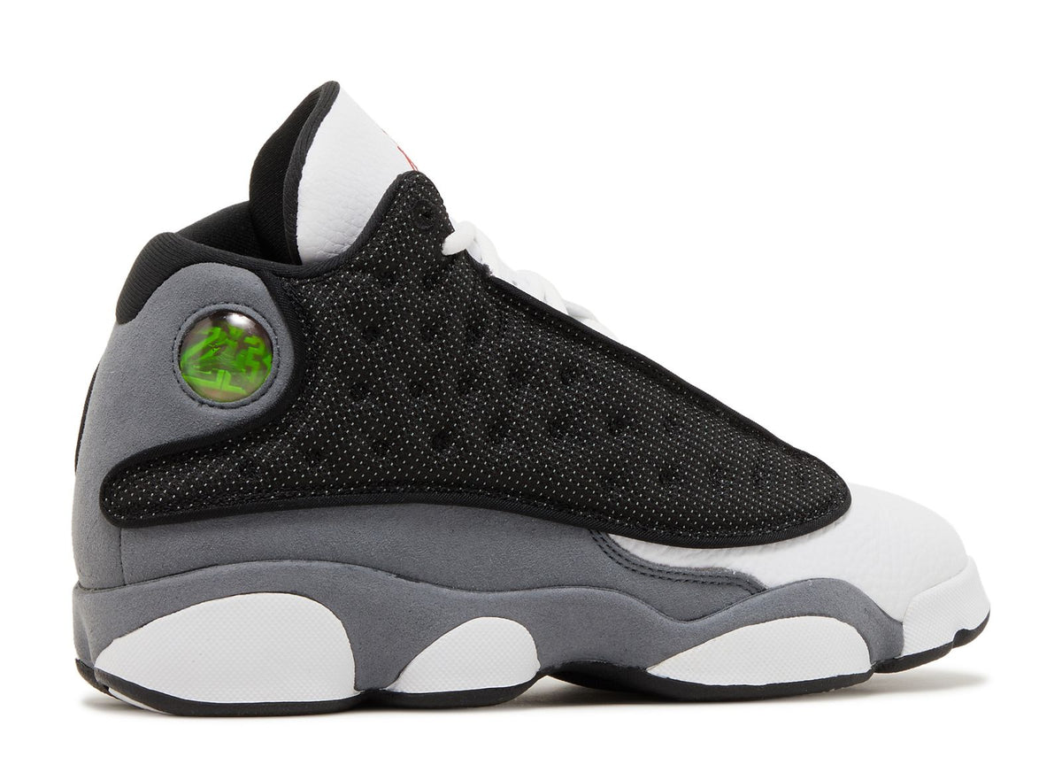 The Air Jordan 13 Retro GS 'Black Flint' is a shoe designed for big kids that celebrates the 25th anniversary of the classic sneaker. The shoe's neutral color scheme is inspired by the OG 1998 'Flint' release, with an upper in white tumbled leather intersected by black 3M mesh overlays and grey synthetic suede midfoot and heel paneling. The tongue features a stitched crimson Jumpman while the lateral collar displays the signature holographic 'cat eye.’ Underfoot, the Phylon midsole offers lightweight cushioning and is wrapped in grey synthetic suede, while the panther paw outsole provides excellent grip and traction.