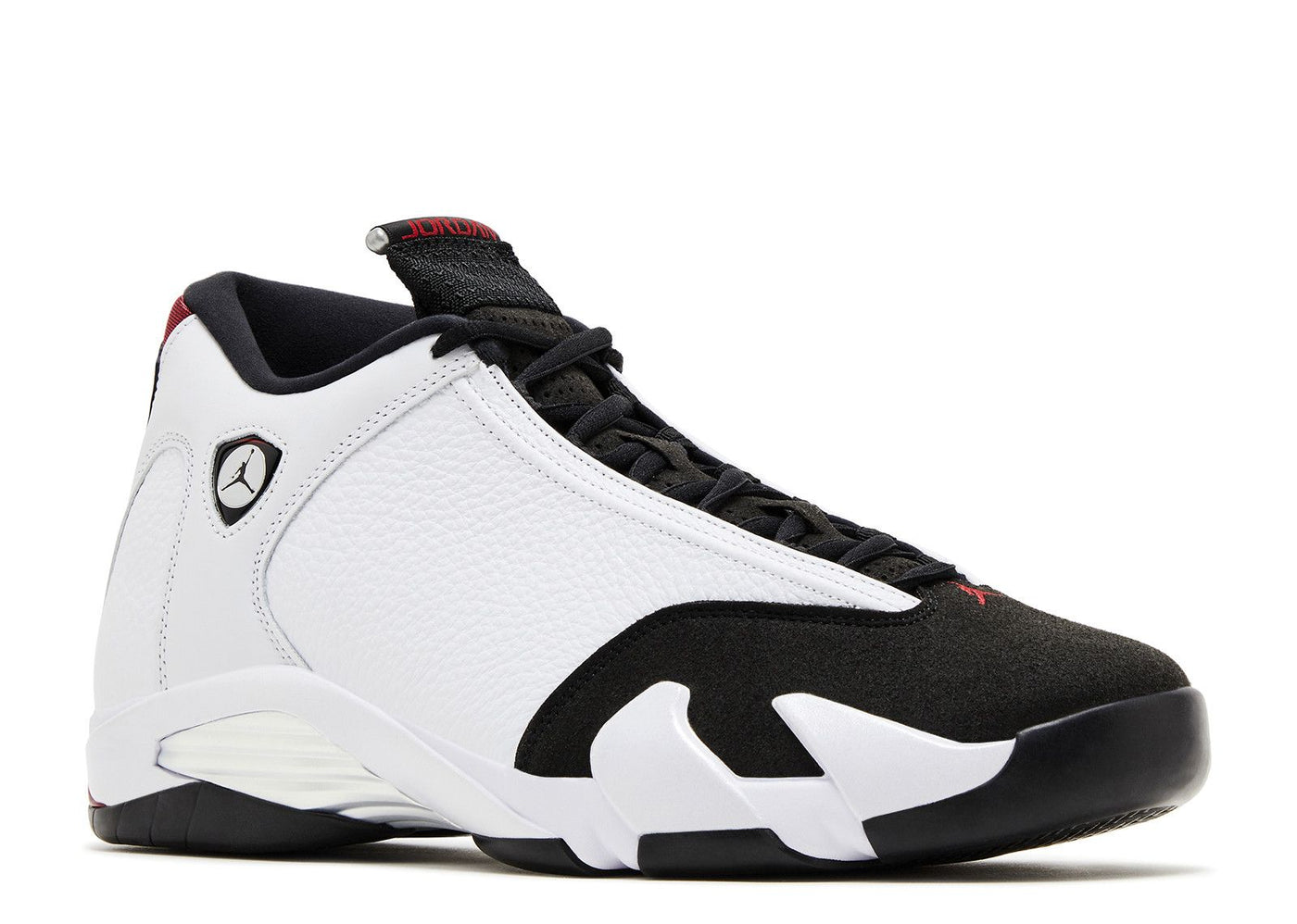 The 2024 edition of the Air Jordan 14 Retro 'Black Toe' sports a white leather upper, highlighted by black suede accents on the toe. The tongue, collar lining and back tab are also black, the latter embellished by a Jumpman logo and a large, stylized '23.' A smaller red Jumpman logo complements the toe box, while a Ferrari-inspired Jumpman emblem decorates the collar. A Phylon midsole is equipped with a chrome-plated shank plate for stability and encapsulated Zoom Air units on the forefoot and heel.