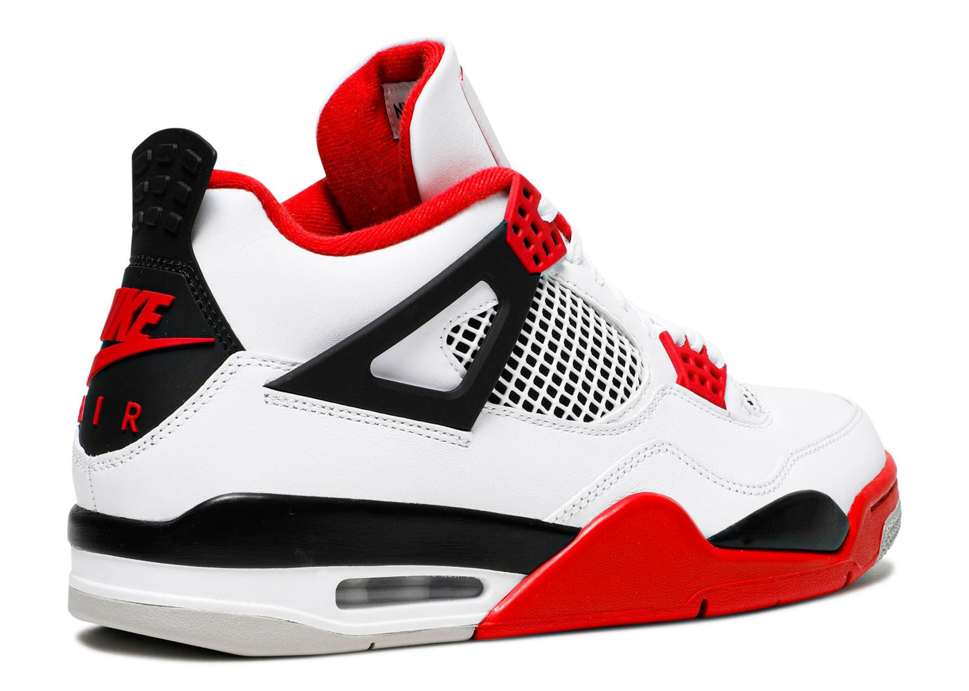 The Air Jordan 4 Retro OG 'Fire Red' 2020 released in 2020, bringing back the OG colorway of the silhouette. The shoe's upper is built with white leather, accented by hits of Fire Red throughout, including the signature eyelets. Underfoot, the midsole houses visible Air in the heel for cushioning, while a Nike Air logo on the heel completes the throwback look.