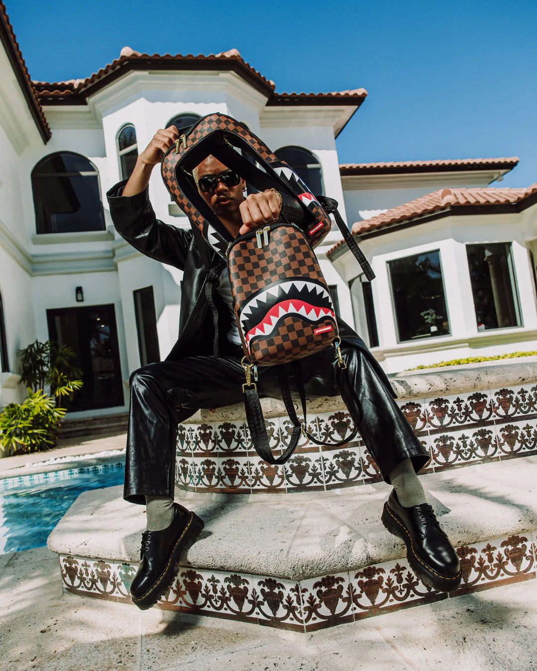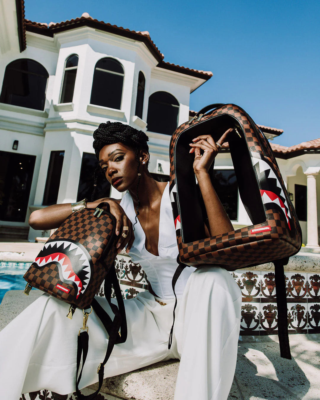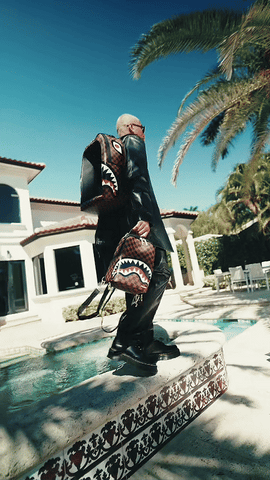 Dimensions: 18" x 6" x 11.5" • Front zipper pocket • Side pockets • Zippered Stash pocket • Separate velour sunglass compartment • Ergonomic mesh back padding • Adjustable Straps for custom sizing • Gold zippers with metal hardware • Metal "Sprayground Authentic" badge • Slide through back sleeve connects to carry-on luggage to free your hands